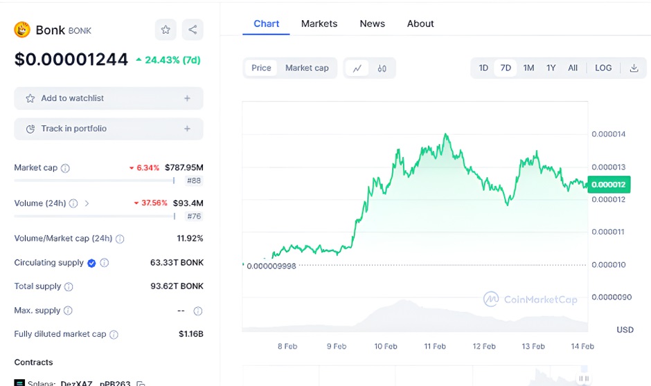 Bonk幣價格在過去1個月內上漲了24%,報價升至0.00001244美元。在整個加密貨幣市場在過去24小時內上漲5%的推動下,Bonk在一周內累計上漲了24%,但與一年前相比,其價格仍上漲了1400%。