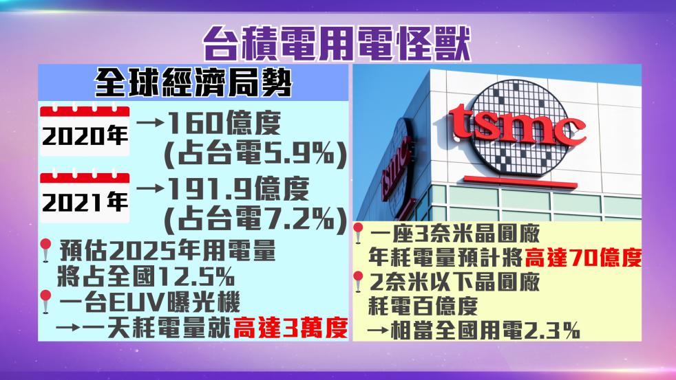 台積電2020年用電量為160億度,約占台電售電量的5.9%;2021年用電量快速成長至191.9億度,占台電售電量的7.2%,用電成長率高達20%,這高於2021年台電售電量成長率的4.9%,預估至2025年台積電用電量將占全國用電量12.5%。