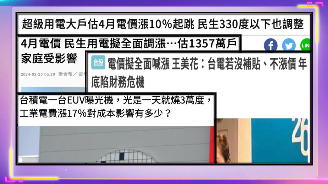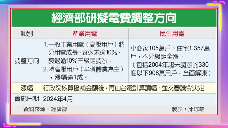四月起電價全面上漲!依據經濟部正在研擬的電價調整方案,為避免虧損擴大,擬不分級距全部調漲。其中,凍漲20年的330度以下民生用電約908萬戶,擬取消凍漲;台電統計,2023年一般家庭平均每月用電約338度。初步推估,若用電330度以下電價調升5%,每月僅增加30元電費,對一般家庭影響不大。