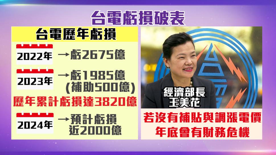 攤開台電歷年的財務報表,2022年大虧2675億,2023年政府補助500億之後,還是虧了1985億,歷年累計虧損已經達到3820億。台電2024年預計虧損近2,000億元,台電將在本周五(23日)召開股東臨時會通過增資案,台電資本將擴大至5,800億元,如果政府沒有採取任何行動台電2024年再度陷入「資不抵債」的局面。