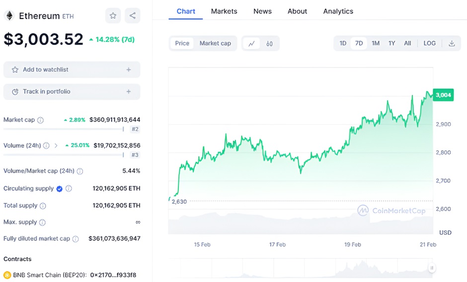 隨著比特幣價格的快速上漲,以太幣價格也跟隨走高,以太幣昨日單日漲幅達到3%,明顯跑贏大盤,將價格推升至3005美元附近,並一直站穩在3000美元大關,周漲幅高達15%。這表明投資者正積極買入以太幣。
