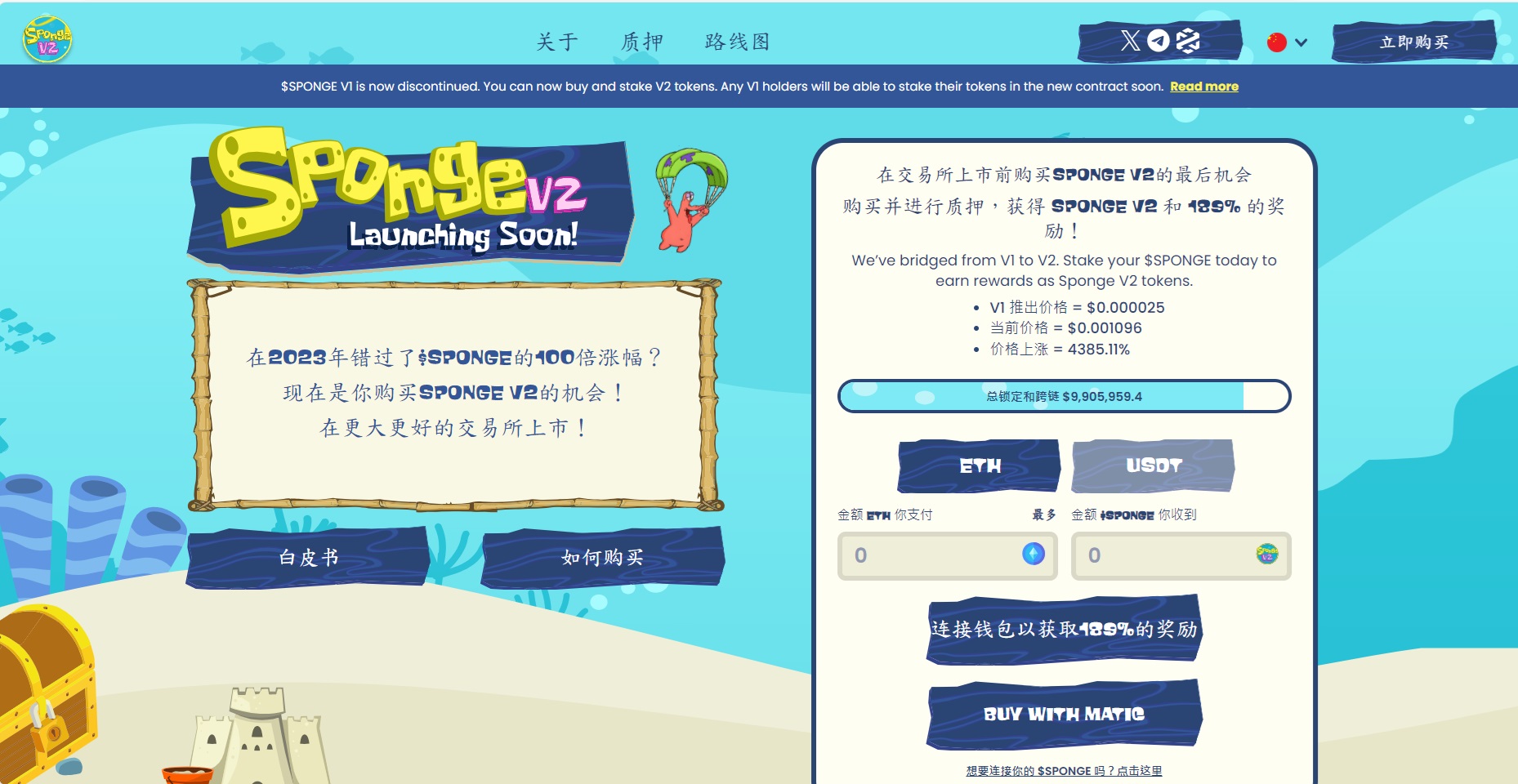 市場都概歎Sponge V1之成功故事將延續至V2之成功,Sponge V1乃2023年最大之模因幣,市值由百萬美金飆升至峰值十億美金,使先行投資者獲得千倍收益, 持有者過萬。