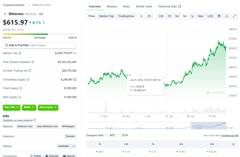 Bittensor項目代币TAO是本輪AI加密行情中最早啓動的項目之一,TAO代币價格從1月15日的200美元左右一路沖至2月16日的700美元,漲幅高達3倍多。