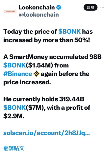 今天Bonk鯨幣(代號$BONK)的價格已經漲幅超過50%。一位大戶在Binance平臺又累積了98億個Bonk鯨幣(約合154萬美元),就在Bonk鯨幣價格上漲前完成了這筆操作。這位大戶目前總共持有319.44億個Bonk鯨幣,按目前價格計算其Bonk鯨幣資產總值約為700萬美元,並已實現290萬美元的收益。