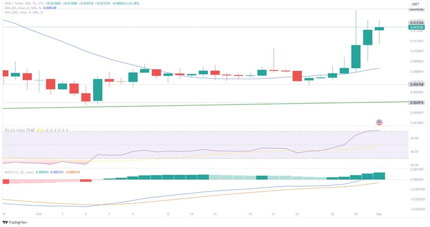 在20天移動平均線上方穩固立足的情況下,WSM價格行動仍然處於牛市突破的態勢(MACD為0.000702),隨著交易量增加了15.28%。