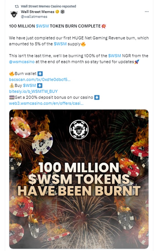 WSM Casino空投公告是在昨天的一次重大燒毀活動之後發佈的,該活動將2023年10月至2024年1月WSM Casino產生的淨遊戲收入(NGR)的100%燒毀。