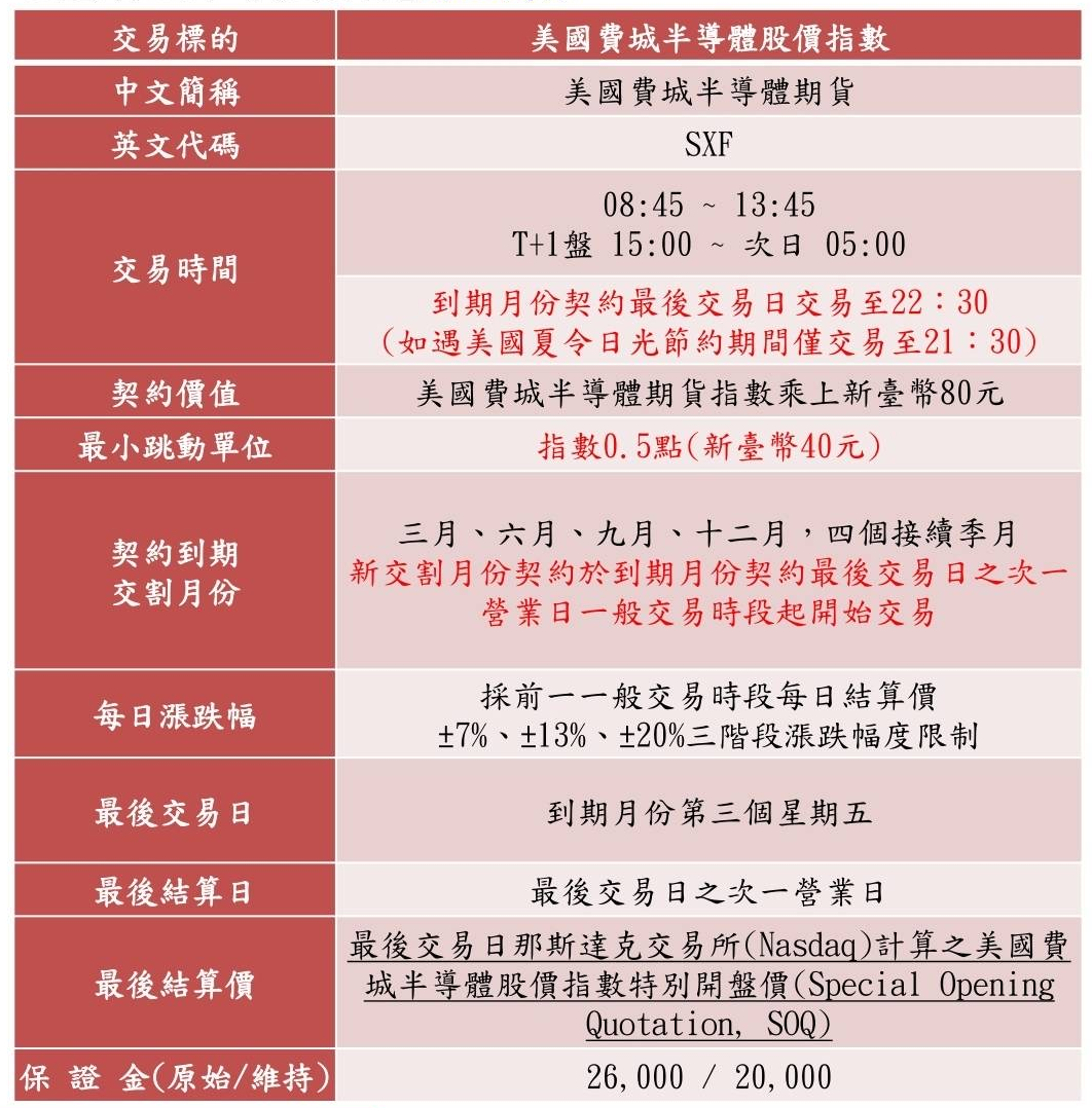 半導體產業具高資本支出及景氣循環特性,波動度高,具交易機會及避 險需求,期交所「美國費城半導體期貨」日夜盤皆可交易,完整涵蓋美國股 市交易時段,方便交易人掌握操作機會,進行風險控管與部位調整。
