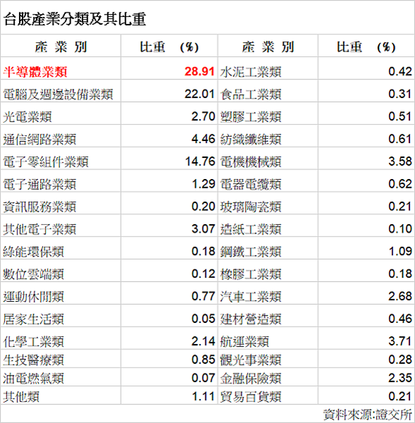 上表清楚揭露了單單一個半導體業就佔了整體加權指數近 30% !這還不包含一些會用到半導體的終端電子產品公司。半導體有如電子產品中的「大腦」,這也是為什麼台積電在國際間有著舉足輕重的地位!當美國相關的半導體公司有較大震盪時,台股中許多公司其實均是其上/下游的相關利益廠商,這時迅速反應的「市場無形之手」也會跟著做出調整!