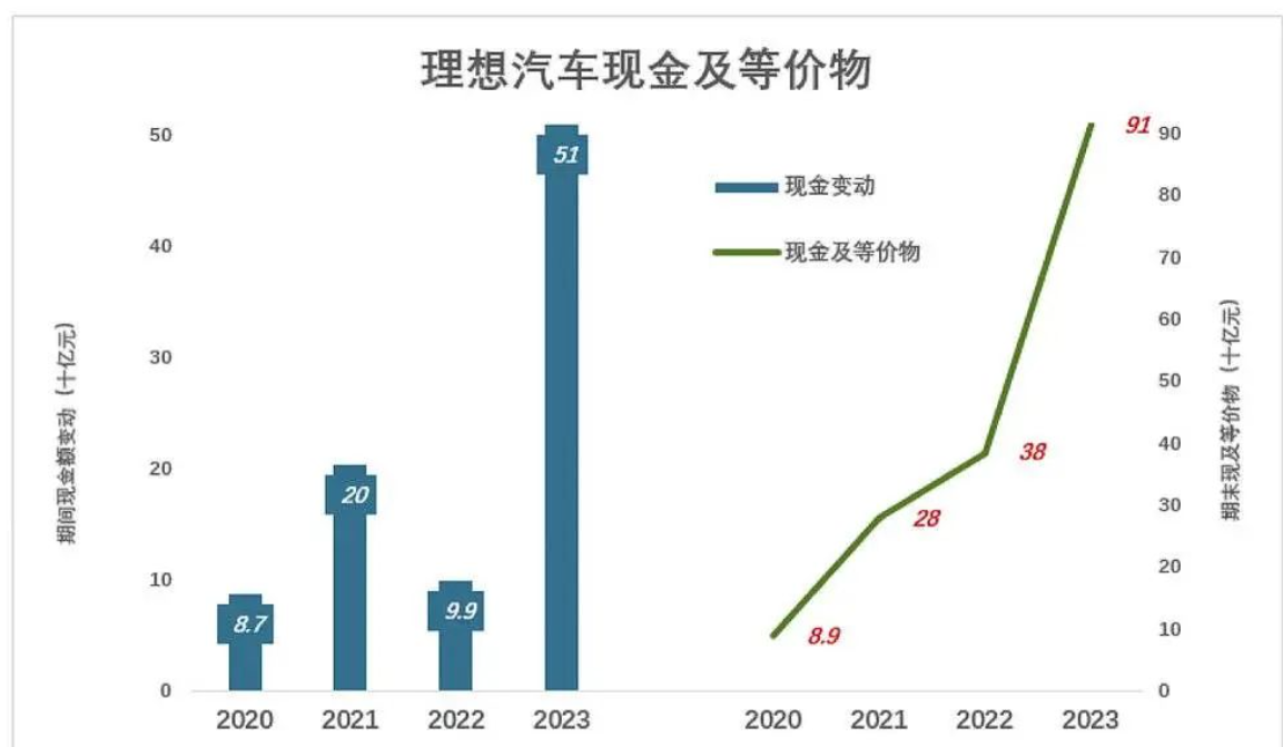 雖說2023年才首次獲利,理想汽車早在2020年經營活動現金流淨額就已經回正至31.4億。2021年,提高到83.4億;2022年,回落73.8億;2023年,暴漲至506.9億。