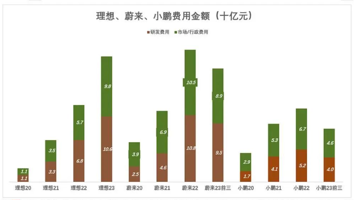 2023年前三季,蔚來、小鵬研發費用分別為94.6億、40億。理想汽車全年研發費用為106億。