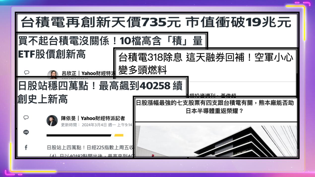 2024/03/04台積電 ADR大漲3.3% ,收在138.26美元,連續三日上漲,逼近歷史新高,2024/03/05台股再創高,台積電(2330)也是再創歷史天價,早盤以735元開出,上漲10元,盤中拉升至738元,漲幅1.79%,市值飆升至19.13兆元,同創歷史新高。