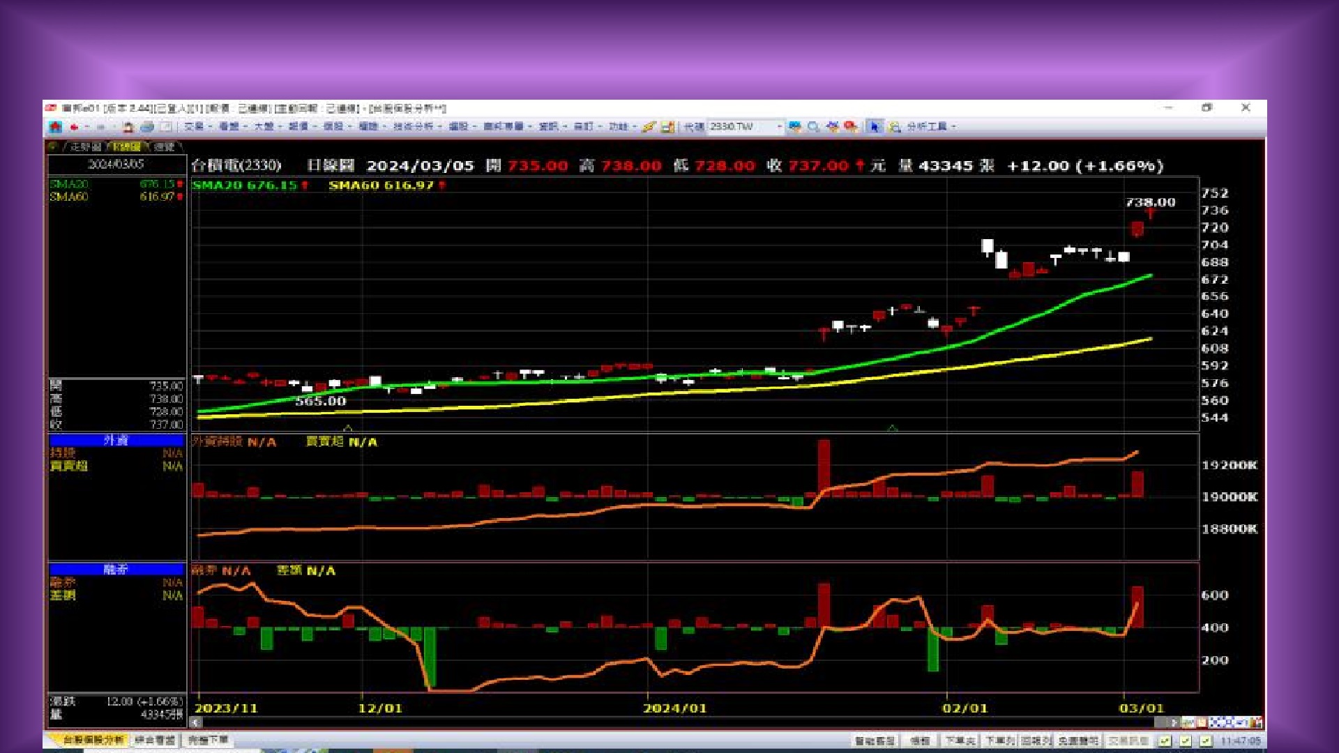 - 2024/03/05外資大買5萬張 持股比衝上74.38%,2年來新高。