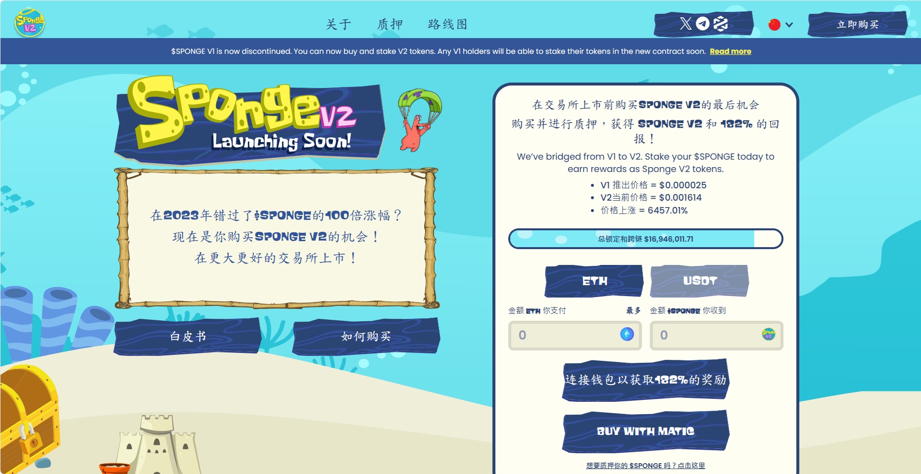 您押的V1代幣越多,押的時間越長,就能獲得越多V2代幣。一旦Sponge V1剩餘發行量耗盡,Sponge V2就會變得可以認領。快來抓住這波接力棒,拿下V2大熱門吧!