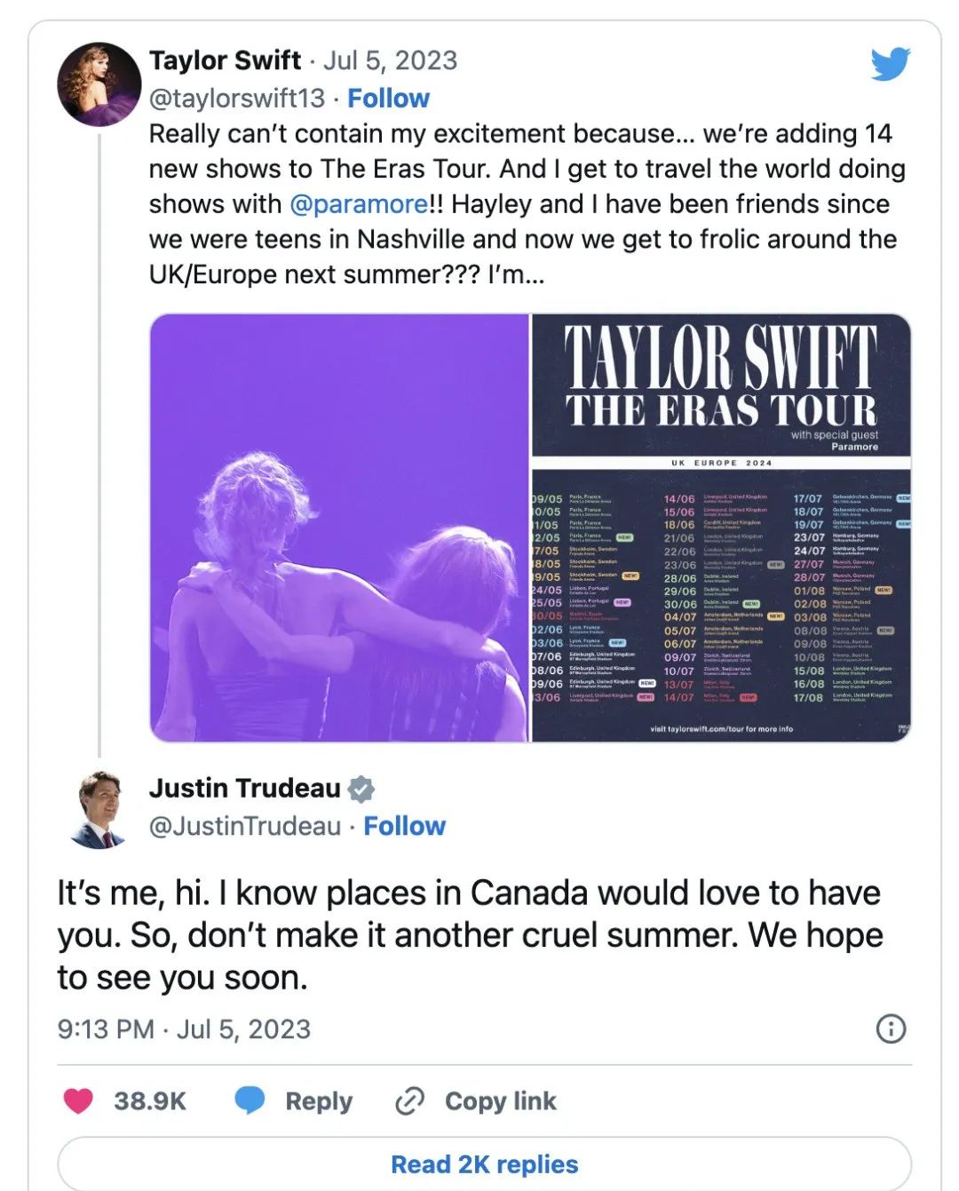加拿大也不在「時代之旅」的行程表上。其總統特Justin Trudeau親自在推特上向泰勒隔空喊話。他稱,「加拿大多個地方都歡迎你來,所以,別讓我們再經歷一個『殘酷的夏天』了,我們希望很快就能見到你。」《殘酷的夏天》也是泰勒的一首代表作。