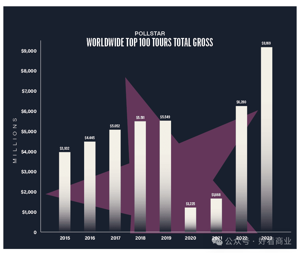根據全球演出市場票房數據服務及媒體公司Pollstar統計,2023年,全球TOP100巡演的總票房從2022年的62.8億美元大增46%,達到91.7億美元。單場平均票房從154萬美元飆漲到237萬美元,漲幅53.2%。