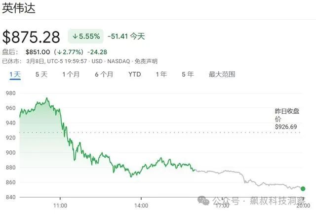 於是輝達的股票崩了。輝達3月9日(北京時間)超跌5.6%,創下了2023年5月31日以來的最大跌幅,單日市值縮水約1300億美元,堪稱美股歷史上最大的單日市值蒸發紀錄之一。