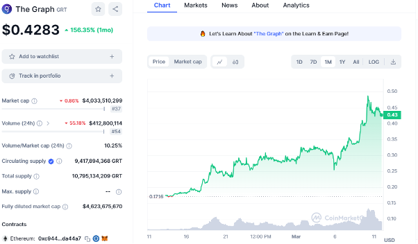 目前,GRT 代幣的價格為 0.42 美元,在過去 24 小時內下跌了 1%。GRT 代幣在過去一周上漲了38%。從 20 日移動平均線反彈觸發平移和處理模式,引發上升趨勢。