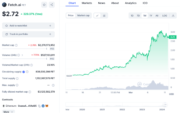 目前,FET 代幣的交易價格為 2.72 美元,比 24 小時前下跌 2%,比一周前上漲 54%,FET 代幣在 20 天移動平均線獲得支撐後也反彈,飆升 72%。