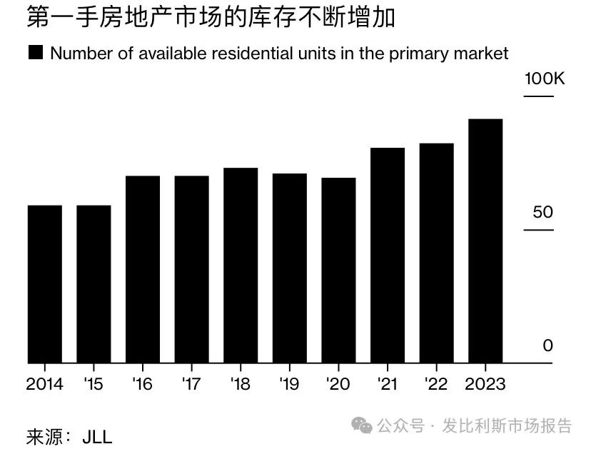 過去一年,香港房地產市場有大量未售出房屋的積累,2023年第四季度,初級市場的住宅單元比三個月前增長了6%,達到91,300套。相較之下,政府數據顯示,從2021年到2023年,平均每年只售出13,000套新房。