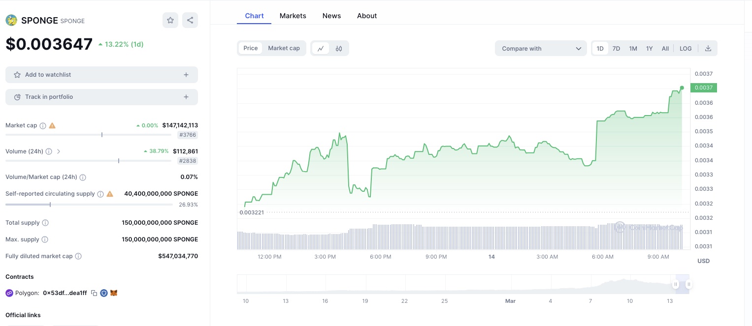 最佳Meme coin Sponge海綿代幣成為增長最快的迷因幣之一,24小時漲幅達25%。