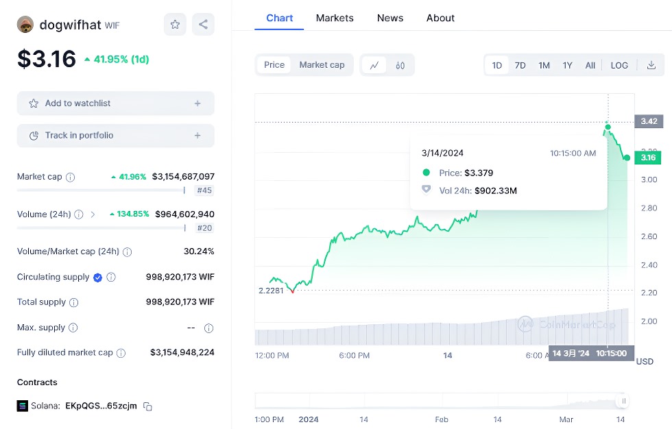 今日3月14日Dogwifhat (WIF) 幣飆升超過 40%,首次超過 3 美元,加密市場的興奮情緒加劇。這種激增反映了投資者對 meme 幣(尤其是 Solana 網路內的迷因幣)重新燃起信心。