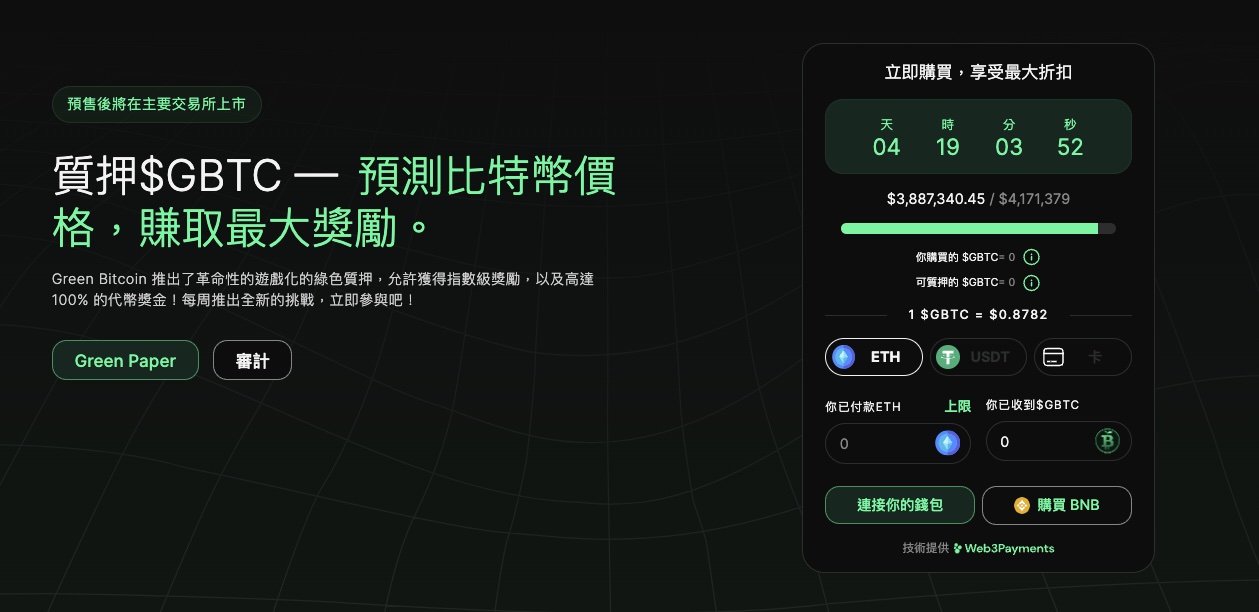 Green Bitcoin比特幣,一種新奇之代幣預售,意在使比特幣價格預測遊戲化,並獎勵那些每日能準確預測價格者。當前,$GBTC 可透過代幣預售購得,您可以以 0.492 美元之折扣價購買代幣。代幣預售有多個階段,每個階段之代幣價格皆逐漸提高。至最後階段,1 GBTC 之價格為 0.492 美元。