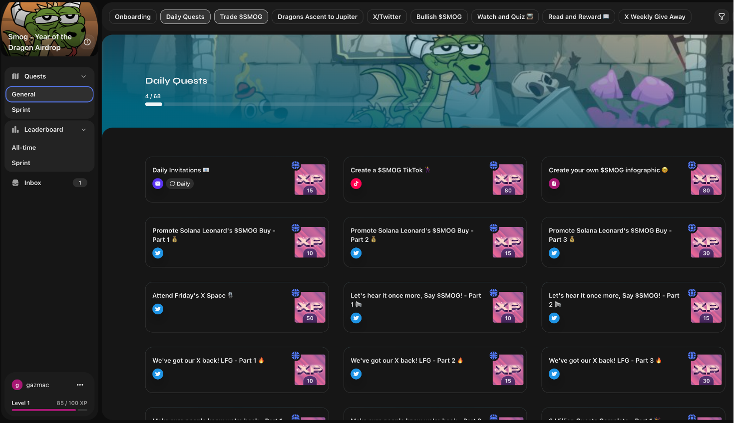 任務可以多種多樣,從邀請朋友參加空投到在 CoinMarketCap 的 Smog 社區頁面上發表評論,或者只是訪問 Smog 網站。每個人都可以參與其中。用戶甚至可以制作一個視頻來提高他們的任務分數,這是以 XP 點數衡量的。將視頻發送到 TikTok 並獲得更多經驗值。