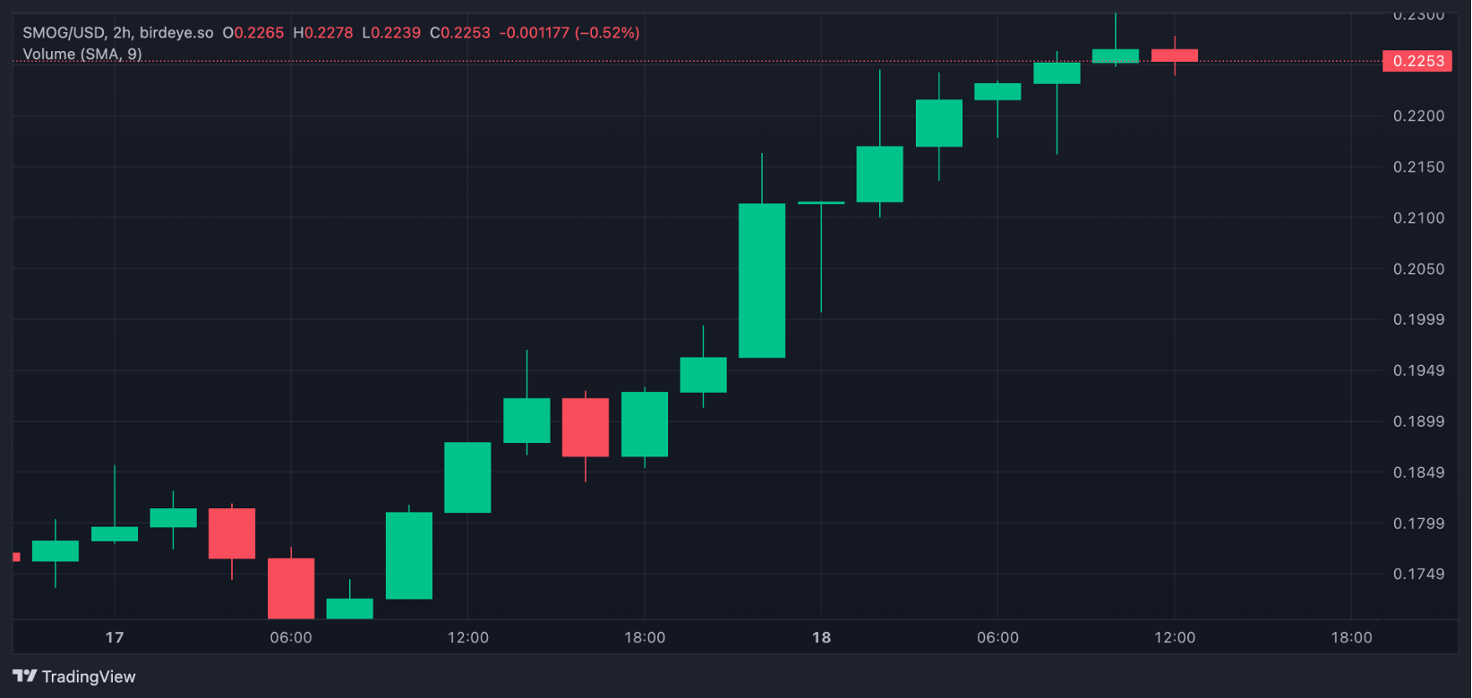 新的 Solana 迷因幣 $SMOG 於 2024 年 4 月 3 日結束其空投的第 1 季,推測價值約為 100 萬美元,推動價格上漲 28% 至 0.2253 美元。
