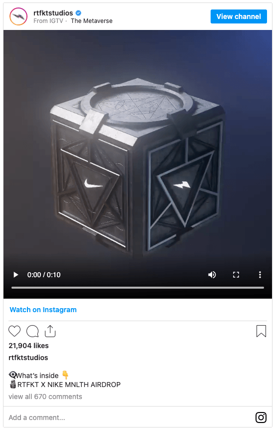 當然,還有一家知名運動品牌商也不甘落後。NIKE公司於去年12 月收購了NFT 工作室RTFKT,並於今年2 月發布了一個名為“ MNLTH ”的神秘箱子。這個神秘的箱子裡面究竟裝了什麼東西尚不清楚,目前已經被空投給了《Clone X》 NFT 持有者。《Clone X》是RTFKT 和日本當代藝術家Taskashi Murakami 合作推出的NFT 系列。值得一提的是,“MNLTH ”目前在OpenSea 平台上的售價已達12,325 美元(4.5 ETH)。