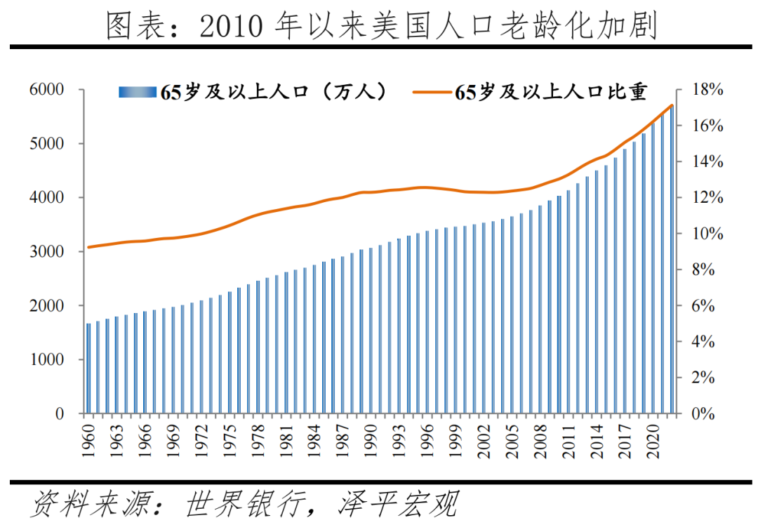 1)美國1950年代開始進入高齡化社會,1950-2022年美國65歲以上老齡人口佔比從8.1%升至17.1%,人口老化壓力持續增加。根據聯合國1956年發布的《人口老齡化及其社會經濟後果》以及1982年維也納世界老齡大會確定的老齡化與深度老齡化劃分標準“65歲及以上老年人口佔總人口比重超過7%”、“ 60歲及以上老年人口佔總人口比重超過10%”,美國在1942年就已經進入老齡化社會,65歲及以上老年人口佔比達7.1%。受生育率下降及壽命延長影響,1960-2023年美國65歲以上老年人口數量由1646.9萬人升至5320.6萬人,佔比由9.1%增至17.6%,特別是在2010年以來增長迅猛,在2013年佔比超過14%,進入深度老化社會。2022年美國總和生育率降至1.66,處於近百年來最低水平,由於疫情對社會和經濟發展帶來較大的不確定性,育齡婦女對生育的偏好降低。