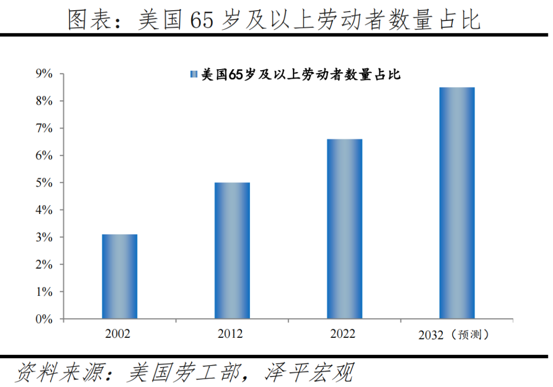 3)透過推廣老年教育、退休金激勵及改善老年健保制度,美國不斷推動老年就業。一方面,政府不斷推動老年教育。隨著1950年代美國逐步步入老齡社會,1965年美國制定了《高等教育法》和《美國老年人法》,規定老年人可以參與公立社區學院的學習;1971年白宮召開的老齡問題會議強調了終身教育的概念,並鼓勵老年人再就業。隨著高等教育的普及,老年人口素質不斷提高,不再滿足於一般的休閒娛樂活動,20世紀90年代,老年遊學營、退休學習學院等廣泛發展起來,同時,高校也對老年人開放,並招收老年學員。另一方面,政府推出一系列鼓勵老年人就業的措施。由於部分低收入老年人有較為迫切的就業需求,1965年美國實行社區就業計劃,為55歲以上低收入人群提供培訓與社區就業的機會;為了促進老年人自我僱用、擴大就業,2010年奧巴馬政府推出平價醫療法案,使得不在大型企業工作的老年勞動力也能獲得高品質、價格低廉的醫療保險。根據美國勞工部數據,1999-2022年美國65歲以上勞工數量佔2.9%增加至6.6%,預測2032年將達8.5%。