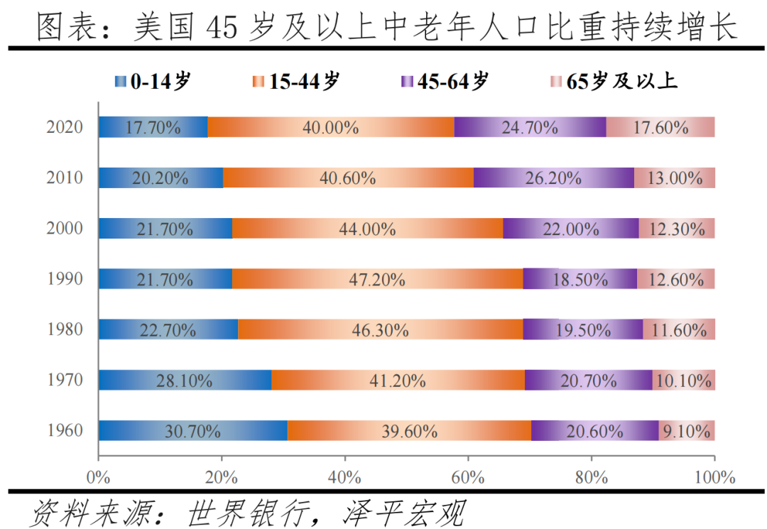 升至38.9歲,中高年齡層人口佔比持續上升而青少年人口佔比明顯下降,未來老化問題將持續加劇。從1950年代開始,美國人口中位數年齡整體呈現上升趨勢,1950-2022年從30.2歲升至38.9歲。分年齡層看,1960-2022年14歲及以下少年兒童人口佔比從30.7%降至17.7%,下降顯著;而45-64歲、65歲及以上人口佔比分別從20.6%、9.1%增至24.7%、17.1%,且目前仍在加速成長。年齡金字塔更能直觀反映出各年齡層所佔比重及未來年齡結構的發展趨勢。20世紀中葉美國人口年齡金字塔為擴張型,塔形上尖下寬,低年齡組人口佔比最大並向高年齡組縮減;20世紀末已演變為穩定型,54歲及以下各五歲年齡組佔比基本相等,55歲及以上各五歲年齡組佔比隨年齡增大逐漸減小,塔形較直;2020年以來,人口年齡金字塔已明顯向衰退型演變,即低年齡組人口占比較小、中高年齡組人口占比較大,塔形趨於上寬下窄,顯示未來美國人口老化問題將會進一步加劇。