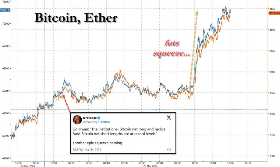 把所有的事情都放在一起,高盛週日預測到「又一次史詩般的逼空即將到來」。正如高盛所言,比特幣期貨市場發生了一場“史詩級的逼空”,對沖基金的空頭頭寸在價格急劇上漲後無法堅守而被迫平倉。(金十財經)