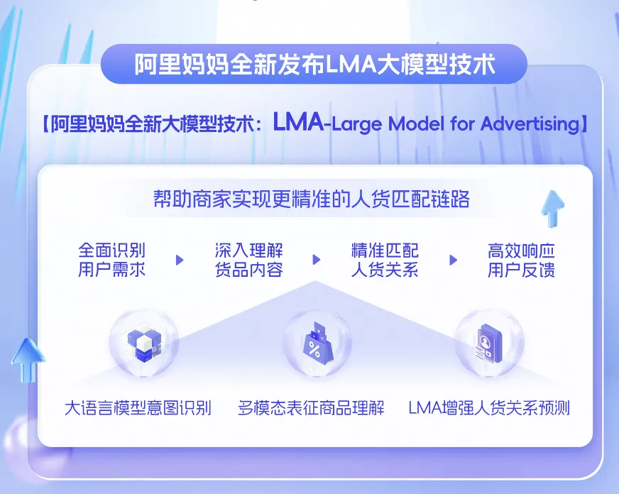 LMA是Large model for advertising的縮寫,它的最大突破在於基於多模態大模型的能力,實現了機器對消費者消費需求的精準把握,從而極大提升人貨匹配效率。簡單來說,LMA是在阿里自研的大語言模型基礎上,針對電商場景實現超大規模多模態表徵的預訓練,能夠對商品的文本、圖像、視頻等多種模態有深入的融合理解,再結合海量消費者行為資料進行模型微調,使得模型更懂人。