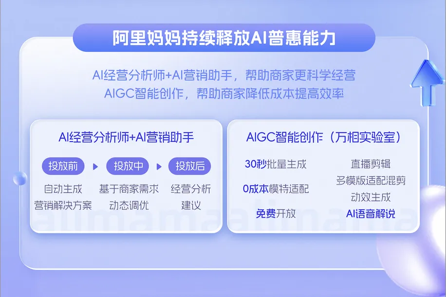 除了營運扶持,阿里媽媽也將持續向商家開放一系列新的AI工具,例如全新推出的AI經營分析師、AI行銷助手,幫助商家做到即時市場波動監測、經營分析建議和自動產生行銷解決方案等。同時,包括萬相實驗室等AIGC智慧創作工具免費向商家開放,幫助商家秒級大量智慧生成圖文、智慧剪輯影片、智慧搭建商品頁面等,讓商家降本增效。