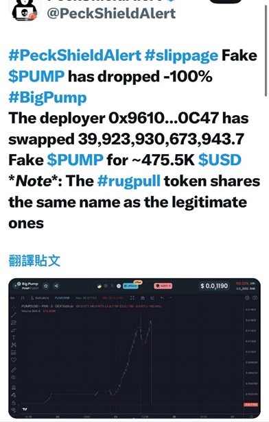 近日一個名為$PUMP的假冒代幣遭到拉毯式套現欺詐,一個名為0x9610...0C47的地址,發行了高達39,923,930,673,943.7個PUMP代幣,並通過交換得到約475.5萬美元。需要注意的是這個欺詐性代幣與合法的PUMP代幣同名,容易引起投資者混淆。