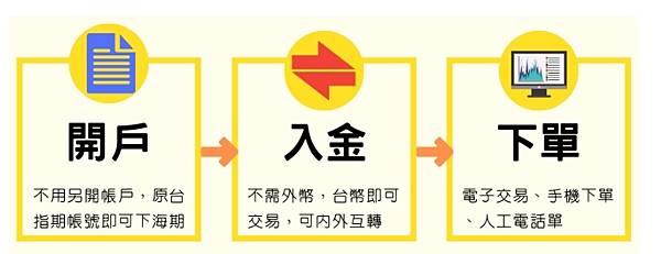 開完期貨帳戶後,保證金可以台幣直接入金,再透過期貨商提供的國內外保證金互轉功能,以網路操作將台幣換成外幣,即可交易海外期貨。