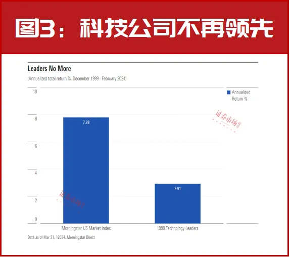 相較之下,1999年的科技繁榮只包含幾家公司,且主要集中在電子和電信業。但它們中很多都只在2000年左右表現良好,後來就再也沒能複製當時的輝煌。例如,美國線上(AOL)和朗訊(Lucent)一敗塗地,思科公司(CiscoCSCO)和國際商業機器公司(IBM)的情況也很差,它們在2023年公佈的淨收入低於24年前的1999年。