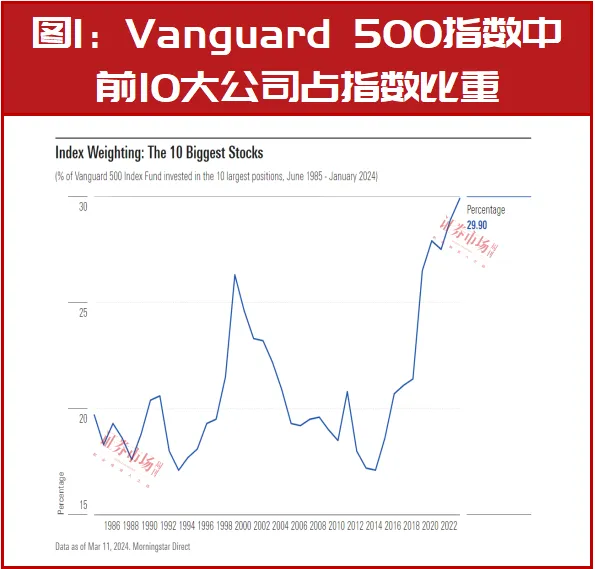 下圖顯示了從1985年到2024年1月,Vanguard 500指數(VFINX)中前10大股票占指數的百分比。