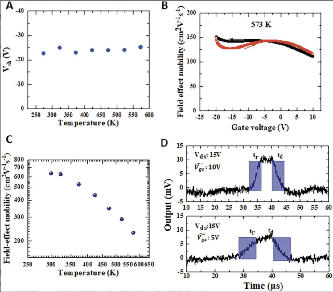 其中I d,stat表示飽和區的漏極電流,C ox表示閘極氧化物的電容。我們嘗試使用方程式( 2 )來確定場效應電子遷移率。然而,在300 K時,場效應遷移率低至0.02cm 2 V -1 s -1,明顯偏離霍爾測量所測得的合理值(低近3000倍)。將串聯電阻代入等式(2)不會導致遷移率本質上改變。隨著溫度的升高,觀察到場效應電子遷移率增加,這是不合理的。在573 K時,使用公式( 2 )計算出的電子遷移率約為150 cm 2 V -1 s -1(圖4B),在高溫下遠高於基於SiC、GaN和Ga 2 O 3的n溝道MOSFET 。請注意,由於源極/汲極和漂移區中的大串聯電阻以及鑽石中磷的部分熱電離,即使在573 K 時遷移率也被低估。