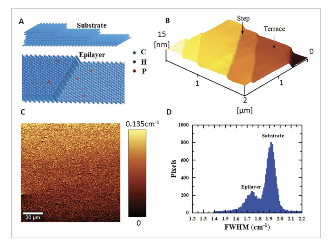 600 nm 厚的輕摻雜n-層鑽石外延層直接生長在HPHT 鑽石基板上。隨後,利用自製的MPCVD反應器在n-層上沉積了100 nm厚的重磷摻雜n+層,並提高了磷摻入鑽石外延層的效率。生長的鑽石(111) 具有未重構的一氫化物封端表面(unreconstructed monohydride-terminated surface)。 n-型鑽石在鑽石(111)基板上的同質外延生長遵循階梯流生長模式。
