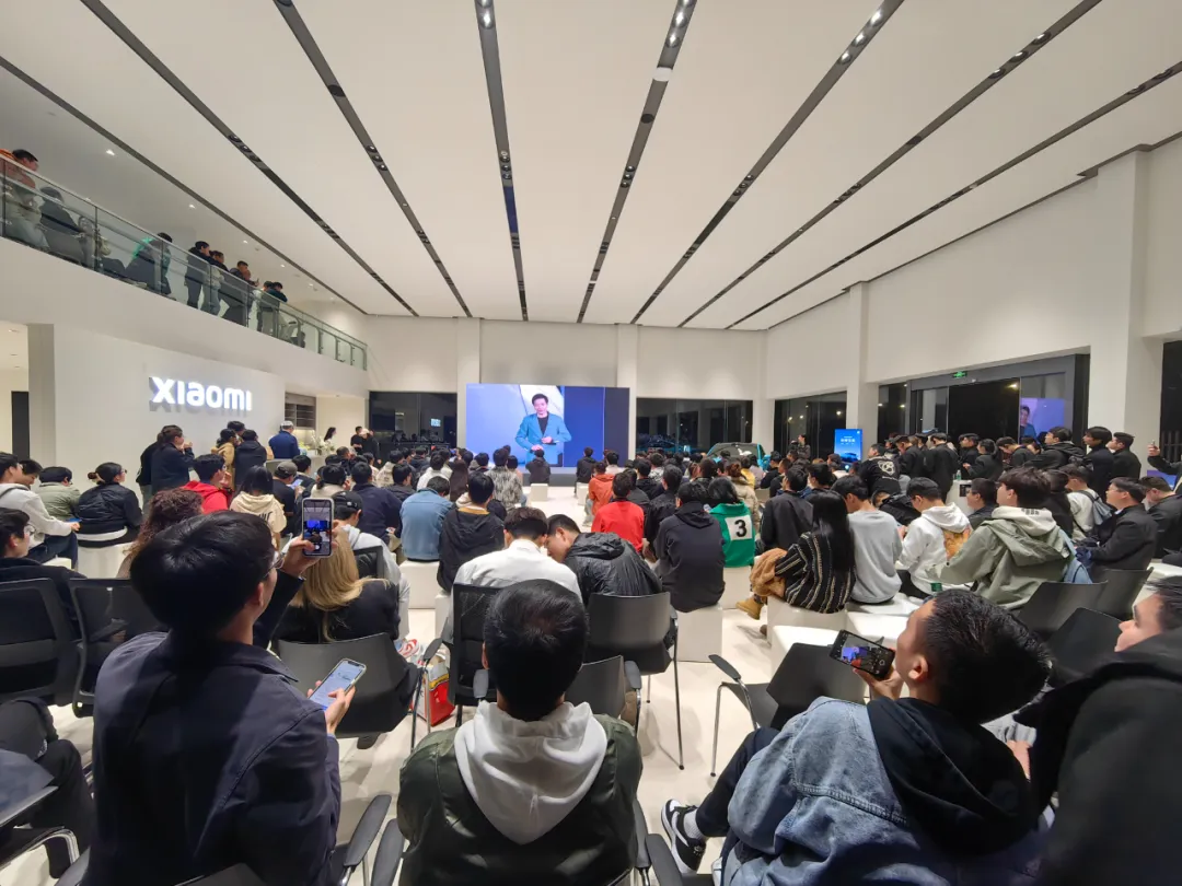 夜幕下的小米汽車杭州西溪店,樓上、樓下都擠滿了人。