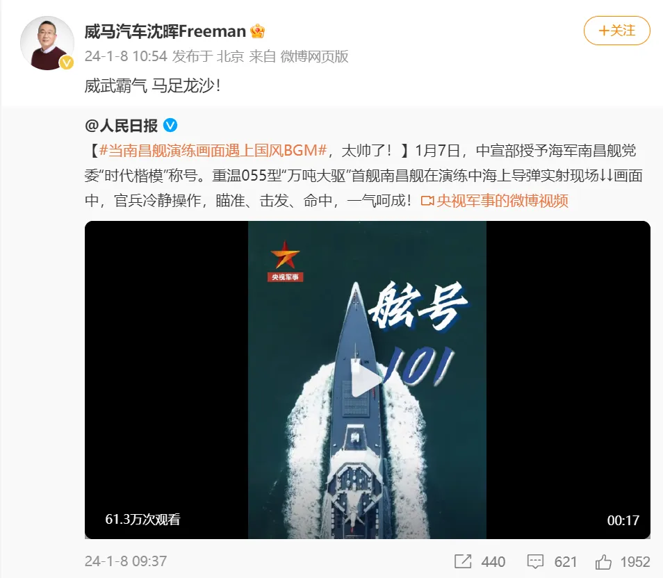 沈暉的微博IP位址一直是在北京,最近一篇發布的微博是今年1月8日,轉載了南昌艦的相關影片。