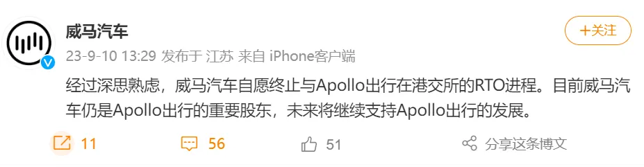 在面臨資金缺口的背景下,威馬汽車一直在尋求IPO(首次公開發行),並先後三次衝擊IPO。 2023年9月10日,威馬透過官方微博表示,經過深思熟慮,威馬汽車自願終止與Apollo出行(港交所上市公司)在港交所的RTO(借殼上市)進程。這標誌著深陷泥沼的威馬汽車第三次衝擊IPO失敗。