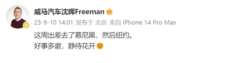 而其最後一次與威馬汽車或其行踪相關的微博則要追溯到去年9月10日,就在威馬汽車官員宣第三次衝擊上市失敗後半小時,他發微博稱“這週出差去了慕尼黑,然後紐約。好事多磨,靜待花開”,不過IP位址在北京。