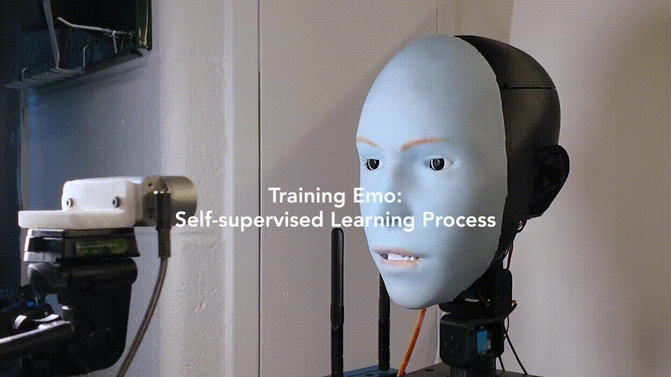 為了訓練機器人如何做出臉部表情,研究人員將Emo放在相機前,讓它做隨機的動作。