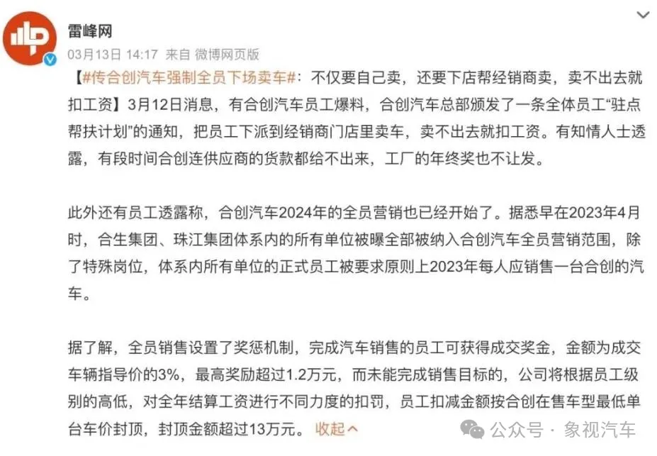 據悉,從去年4月開始,合生集團、珠江集團體系內的所有員工,都被納入合創汽車全員行銷範圍,每人每年必須賣出一輛車。