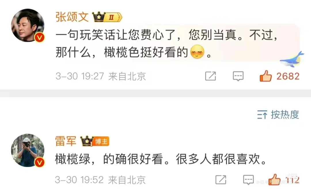 雷軍把交付時間、張頌文喜歡的顏色,都安排得明明白白,還不忘為橄欖綠小米汽車打廣告。