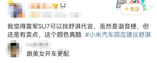 一是諧音梗【SU7 舒淇】非常好記,二是香車配美人。