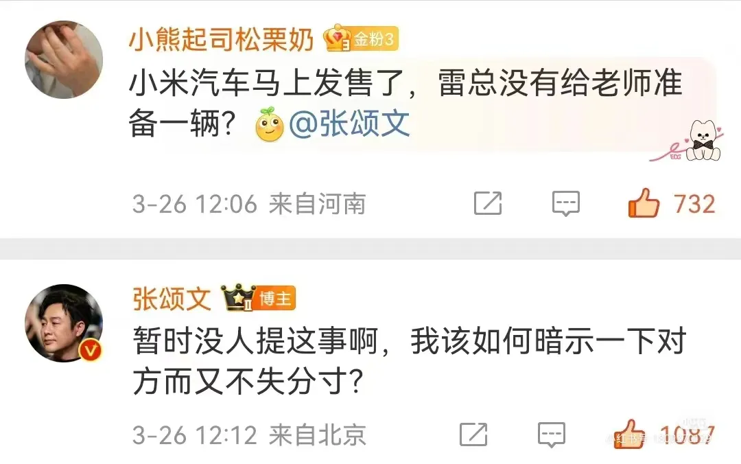 這兩天有網友問張頌文,雷總有沒有為他準備小米汽車。